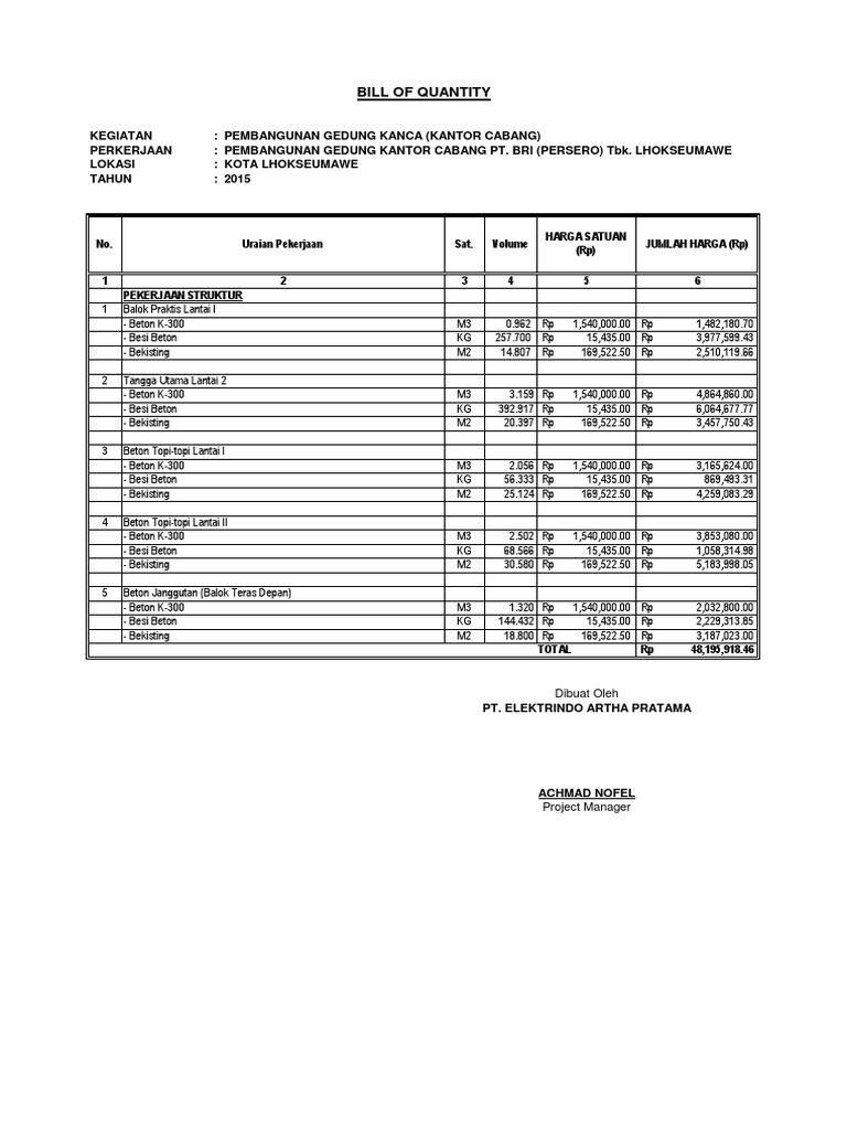 Ditinjau dari pembuatnya, rab dapat dibedakan menjadi 2 jenis yaitu : A wide variety of bill of quantities options are available to you, such as feature, material, and style. Dalam perencanaan sebuah proyek konstruksi, selalu dibutuhkan nilai estimasi untuk mewujudkan proyek konstruksi tersebut. It also (ideally) details the terms and conditions of the construction or repair contract and itemizes all work to enable a contractor to price the work for which. There was a call for more research to be.