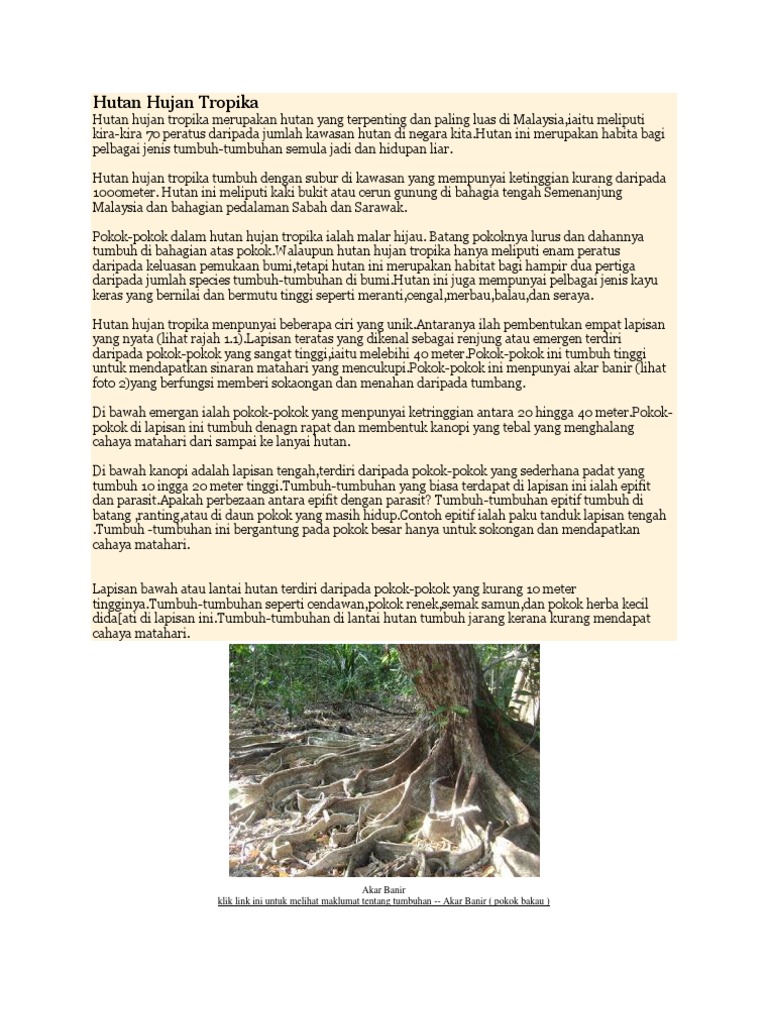 Satu hektar tanah hutan hujan tropika di malaysia mengandungi lebih daripada 180 jenis pokok. Hutan hujan tropika adalah satu khazanah yang berharga kepada semua orang di bumi ini tidak. Ia terletak di kawasan beriklim khatulistiwa (panas dan lembap sepanjang tahun). Hutan simpanan kekal mengikut fungsi : Kelebihan dari taman ini adalah aksesnya yang cukup mudah, infrastruktur yang baik dan senantiasa dijaga, serta biaya yang cukup terjangkau. Struktur hutan tropika di dalam hutan tropika, ketinggian maksimum bagi sudur jarang melebihi 50m. Hutan ini terletak di afrika tengah, amerika selatan, amerika tengah dan asia kepulauan pasifik. Hutan hujan tropika di malaysia boleh dibahagikan kepada dua kelas iaitu hutan campuran dan hutan dominan tunggal. Dikenali sebagai brl, borneo rainforest lodge mungkin merupakan salah satu resort ekslusif dan mewah di malaysia. Berikut merupakan 10 resort hutan hujan tropika di malaysia: Kira di mana kita tinggal. Jegatheswaran ratnasingam, berkata buku teks yang telah dilancarkan oleh timbalan menteri sumber asli dan alam sekitar, dato'. Tumbuhan semula jadi dan hidupan liar hutan hujan tropika.